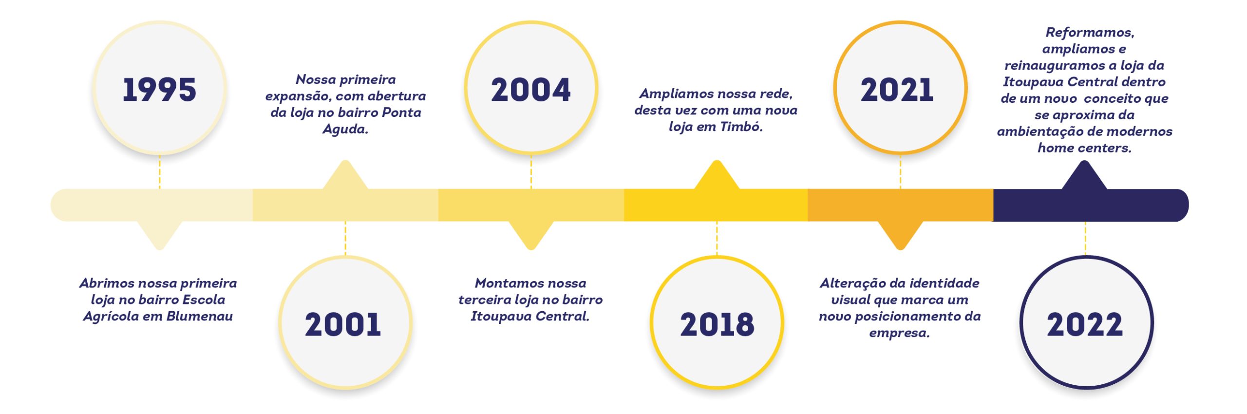 De nossa primeira loja, evoluímos para um conceito moderno inspirado nos amplos home centers, aliados à comodidade de uma loja de bairro. Ampliamos o mix e crescemos no tamanho de nossas lojas, mas com a firme determinação de não perdermos o que pautou nossa história: a simplicidade nos processos e a proximidade com nossos clientes.